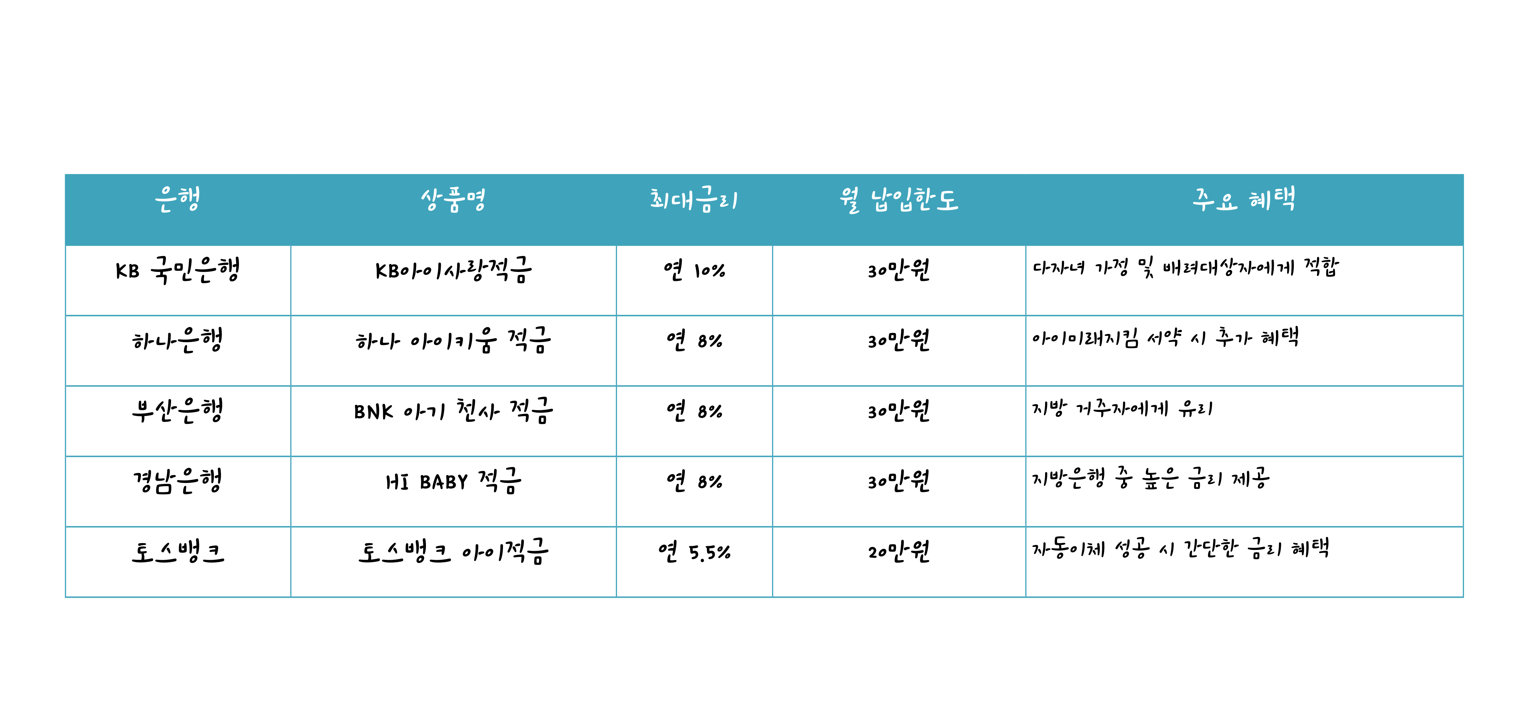 오늘은 각 은행에서 제공하는 아이저축 상품을 자세히 살펴볼게요. 여러분의 가정에 딱 맞는 상품을 찾아보세요!